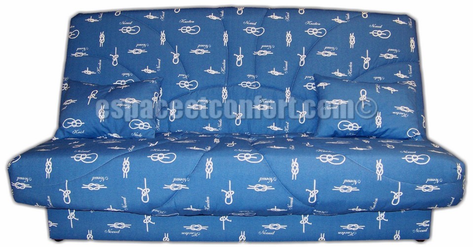 En photo : Banquette clic-clac Soleil, Tissu : Quiberon Bleu Cat.A