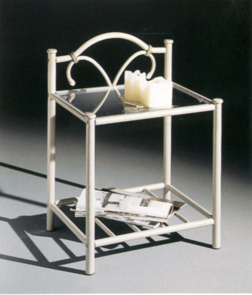 Table de chevet en acier façon fer forgé, laqué époxy, tablette en verre.