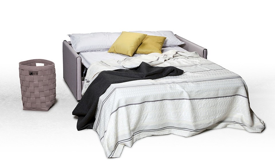 Canapé lit type rapido avec ouverture par renversement du dossier, accoudoirs fins pour les petits espace