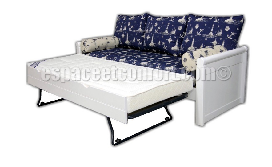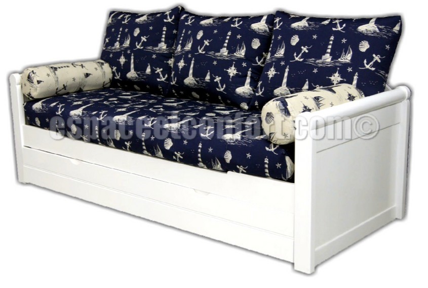 Tissu : LACANAU MARINE Catégorie B, Traversins LACANAU ECRU Catégorie B Couchage 80x190 cm.